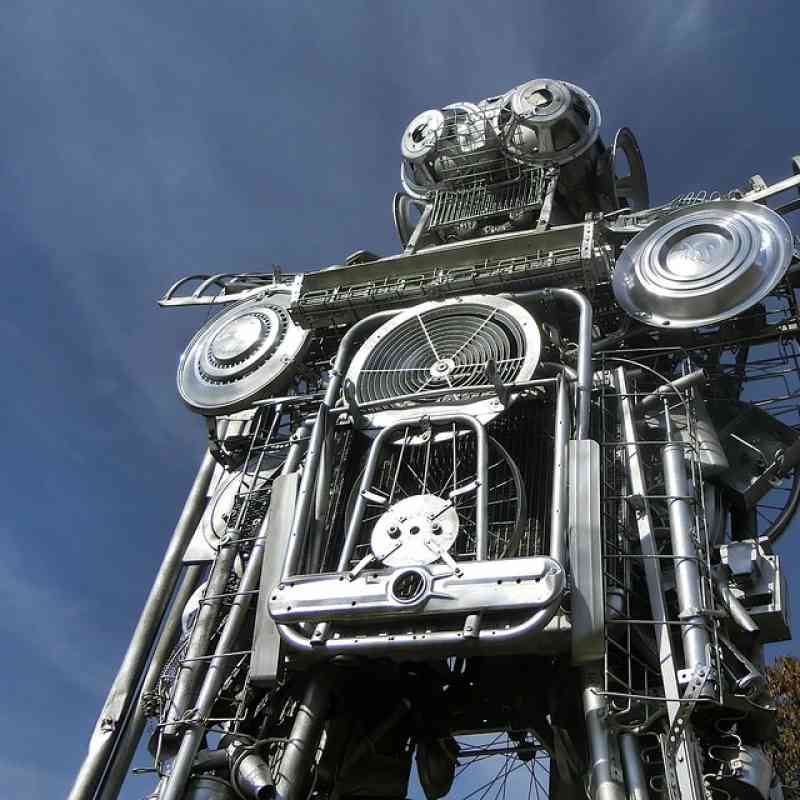 In 10 years of work Mike Goggans has built his Junkosaurus Wrecks from all kinds of scrap metal. Washing machine parts, screws, scrap metal, belt buckles - everything metallic was processed into this 6-meter high prehistoric behemoth. On the roadside, however, the future stands in the form of a scrap robot with the name "Lirpa Anad Nitsud" which is probably the names of the artist's children read backwards.